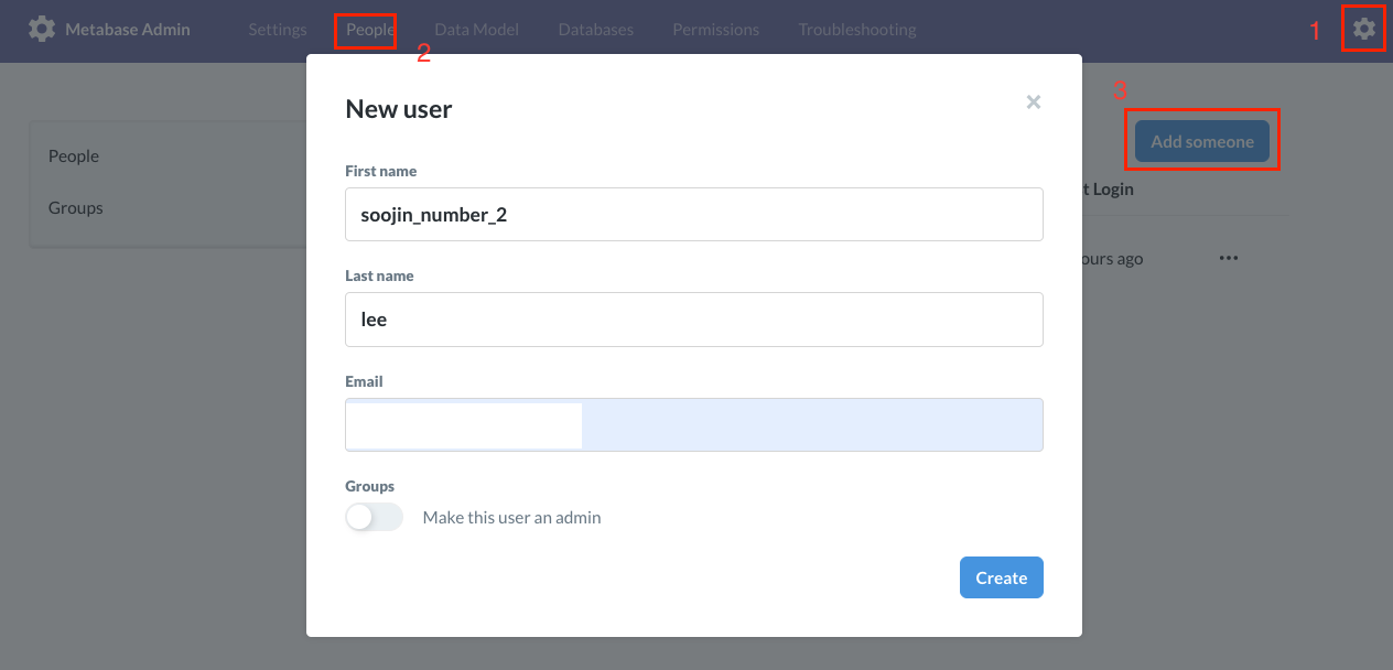 - Metabase 설정 -> People -> Add someone -> New user -> 이름 및 이메일 부여 -> 임시 비밀번호 발급