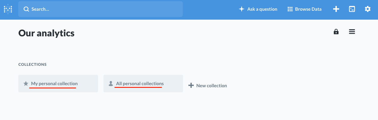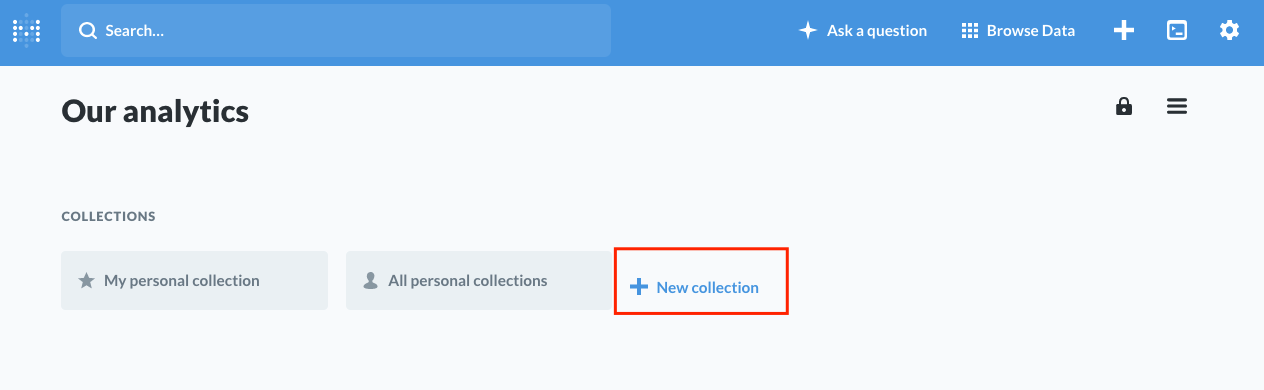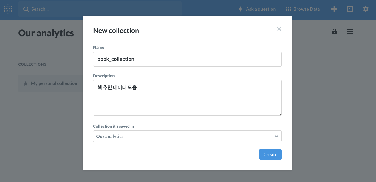 Metabase our analytics 상에서 New collection 버튼을 누르면 새로운 컬렉션을 만들 수 있습니다.
