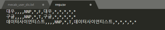 그리고 그 mecab 안에는 nnp.csv라는 파일이 존재합니다. 이 파일을 열어보면 "대우", "구글" 정도의 단어가 초기에 들어가 있습니다.
