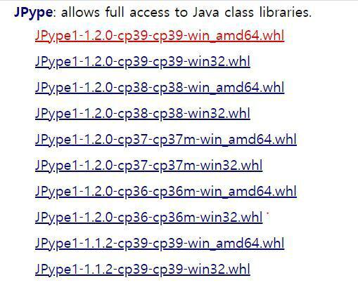 먼저 개요에 올린 링크 중 4번 링크를 들어가서 JPype를 설치해야 합니다. 여기서 주의하셔야 할 점이 있습니다.