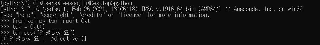 잘 설치가 되었다면 위 코드처럼 konlpy.tag가 import가 잘 될 것이고 실행도 잘 될 것입니다.