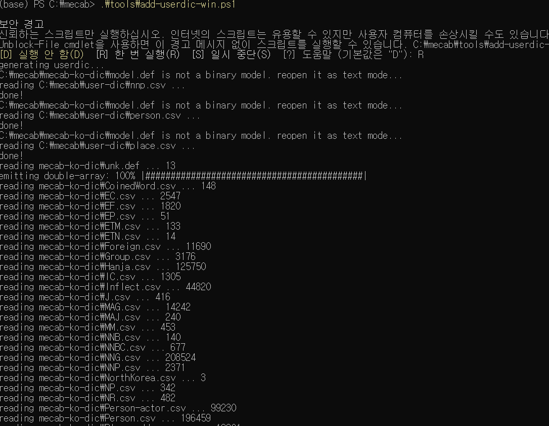 그리고 나서 이제 이 mecab 사용자 사전을 적용시켜줘야 합니다. 그 적용시키는 파일은 add-userdic-win.ps1 이라는 파일입니다.