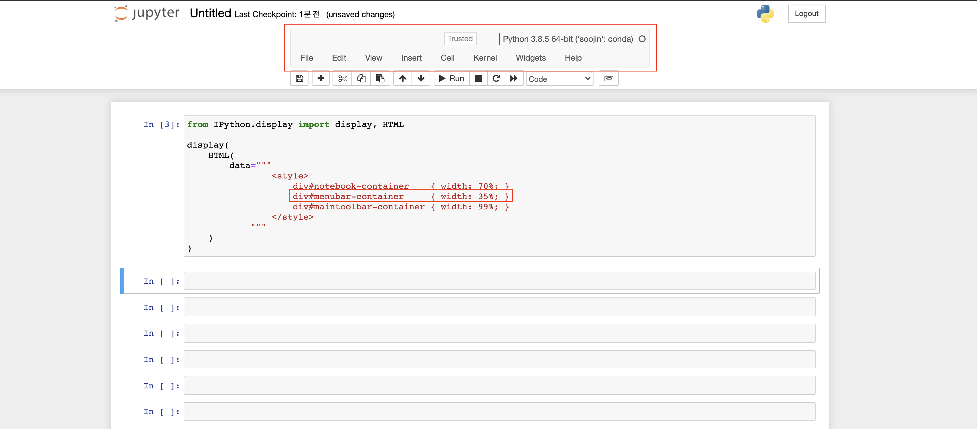 그 중 첫 번째 jupyter notebook 환경에서 cell의 width(너비)크기 조절하는 방법에 대해서 먼저 정리합니다.