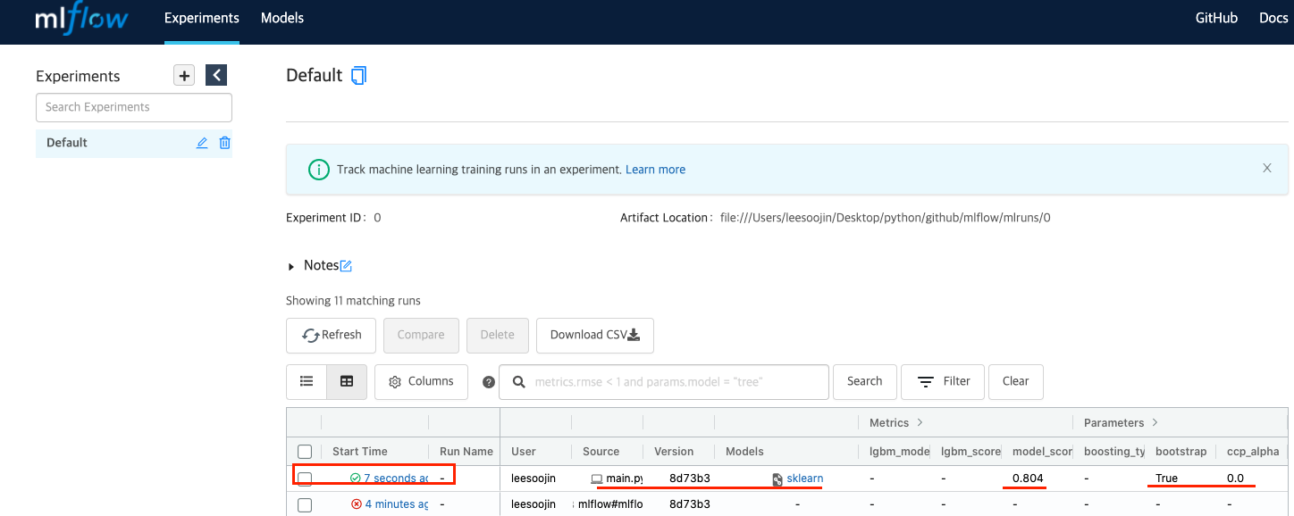이렇듯 mlflow가 지원해주는 model tracking을 활용하면 해당 머신러닝(machine learning) 모델이 어떠한 결과와 어떠한 값을 사용했는지의 logging 정보를 쉽게 확인할 수 있습니다!