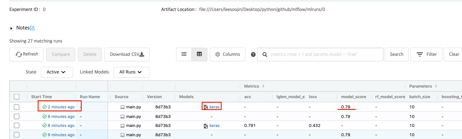 위에서는 사이킷런(scikit-learn, sklearn)을 사용해서 머신러닝 모델을 tracking한 결과를 보여주었는데요. 이번엔 tensorflow2.X의 keras를 사용해서 딥러닝 모델을 tracking 한 결과만 보여드리겠습니다.