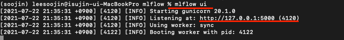 위에서 mlflow tracking을 했을 때 web ui로 확인할 수 있다고 말씀드렸습니다. 이를 확인하기 위해 또 다른 터미널을 열어서 mlflow ui를 입력합니다.