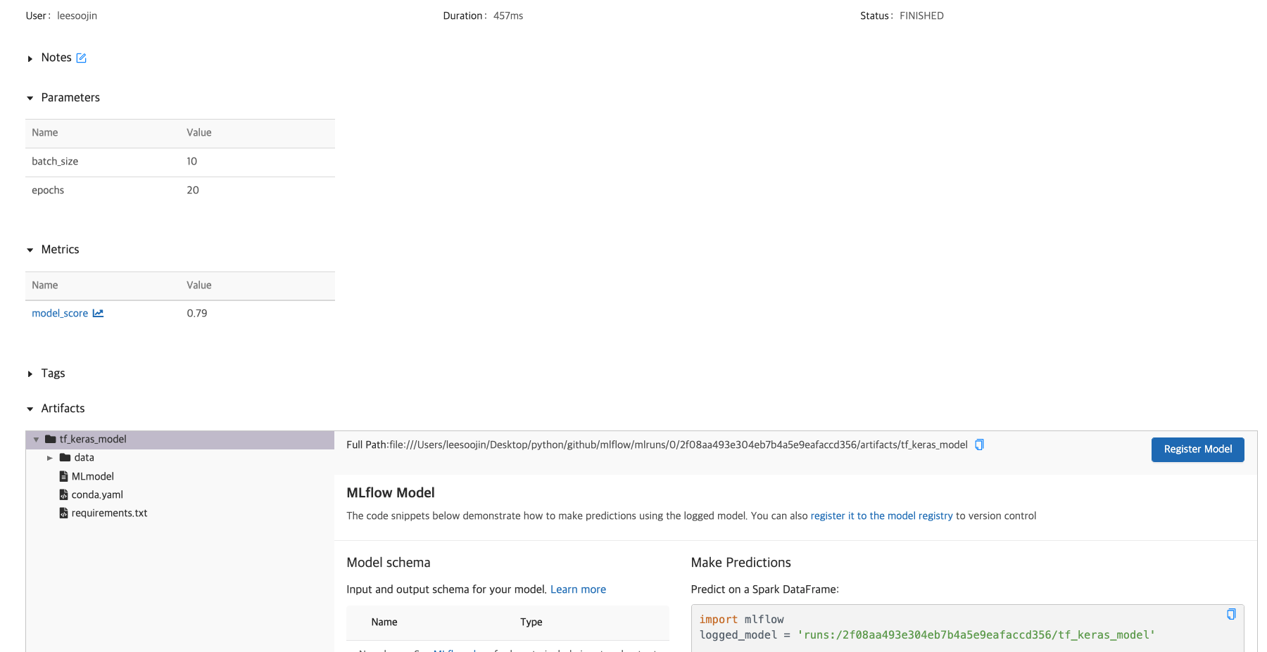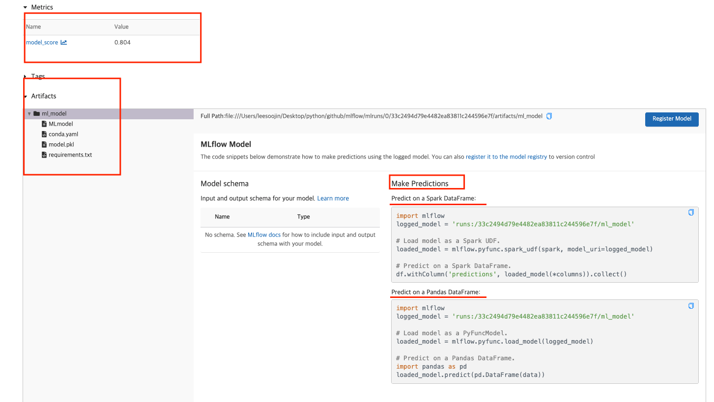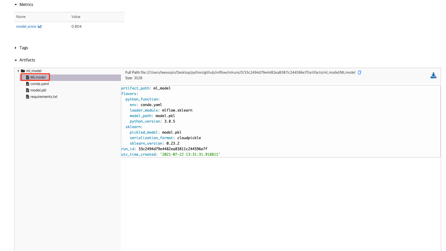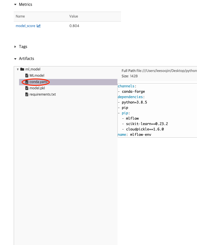 또한, 이 모델의 artifacts를 확인할 수 있습니다. 이 artifacts에는 prediction으로 만들 수 있는 방법에 대한 설명과 MLmodel 파일 내용, conda.yaml의 내용이 있음을 확인할 수 있습니다. 이 MLmodel과 conda.yaml을 활용해서 MLflow Projects를 생성할 수 있습니다. ( 관련한 것은 다음 글에 작성합니다. )