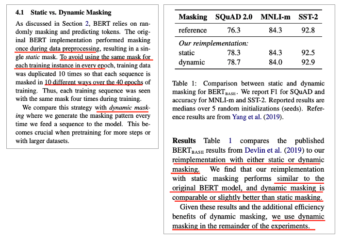 • Original BERT는 mask를 한 번만 하고 고정 (static mask)
