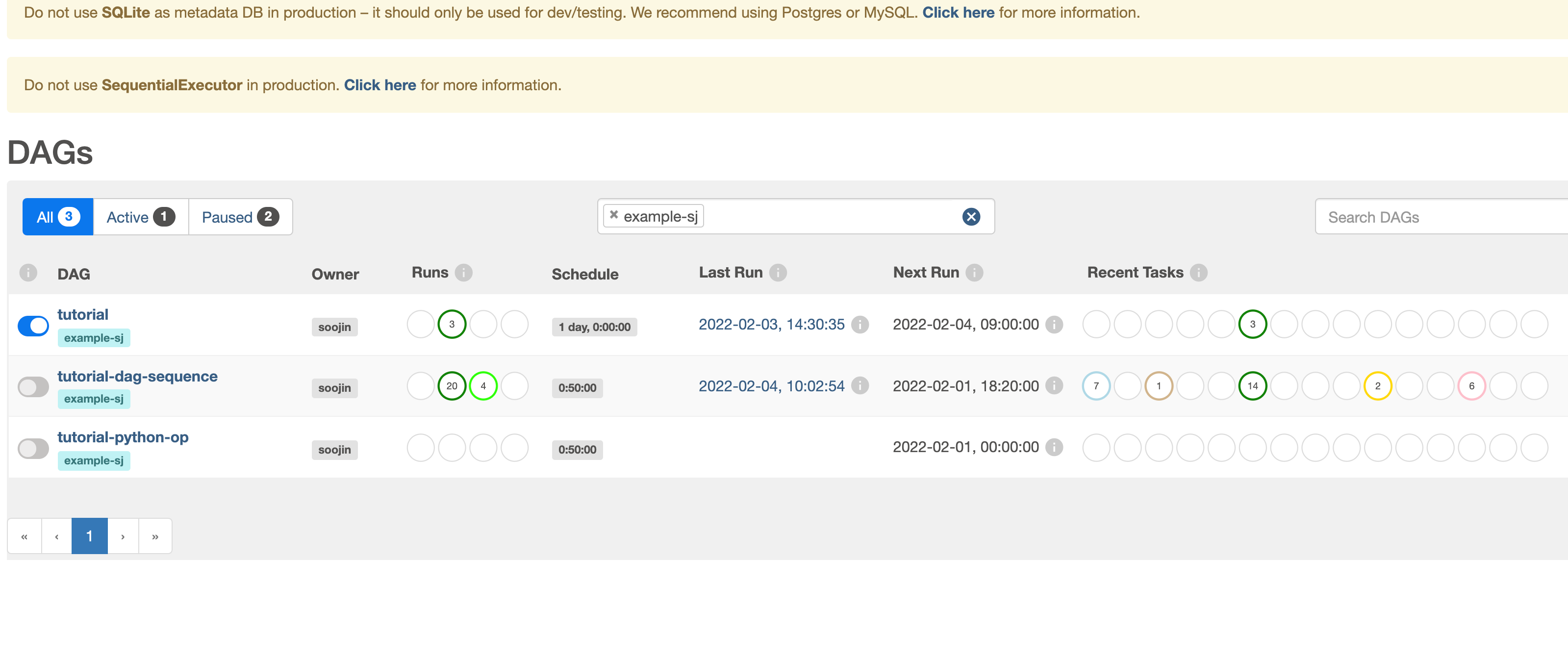 airflow web server를 실행시키고 들어가면 아래와 같이 추가된 DAG들을 확인할 수 있습니다.