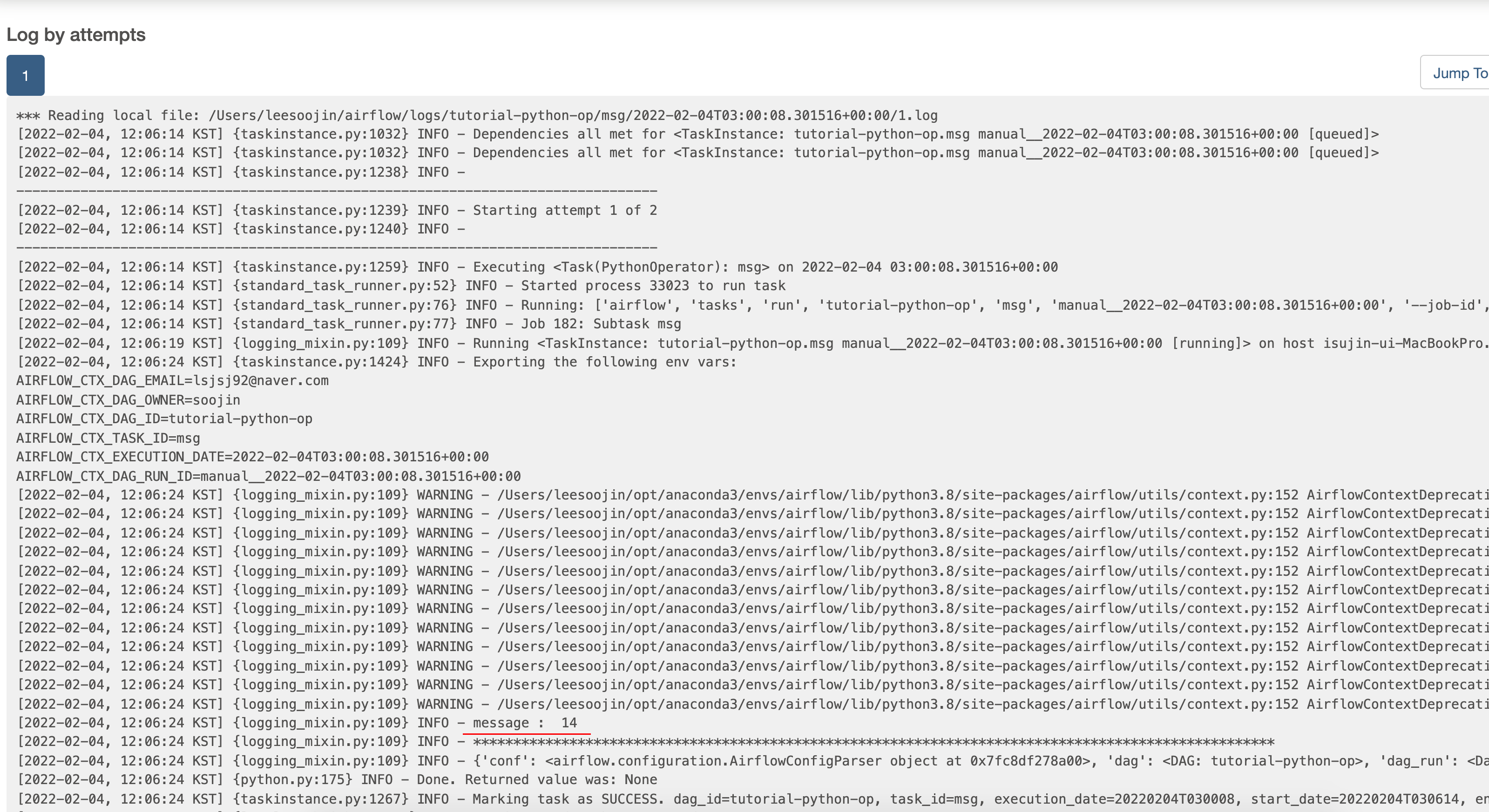 아래 빨간색 줄에서 나온 것처럼 결과 값이 XCom pull을 통해 나와서 출력된 것을 확인할 수 있습니다.