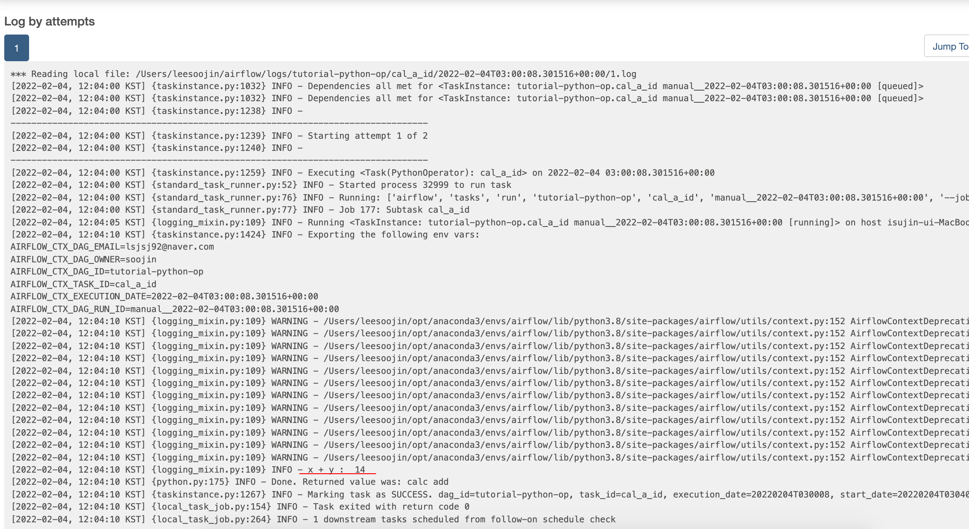 airflow scheduler를 실행시키고 해당 dag를 실행시키면 아래와 같은 결과를 확인할 수 있습니다.