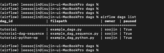 그 전에 먼저 command line에서 airflow 명령어로 dag과 task를 살펴봅니다. 명령어를 입력하면 지난 포스팅과 본 포스팅에서 사용한 dag들이 나오는 것을 확인할 수 있습니다. airflow dags list를 통해 확인할 수 있습니다.