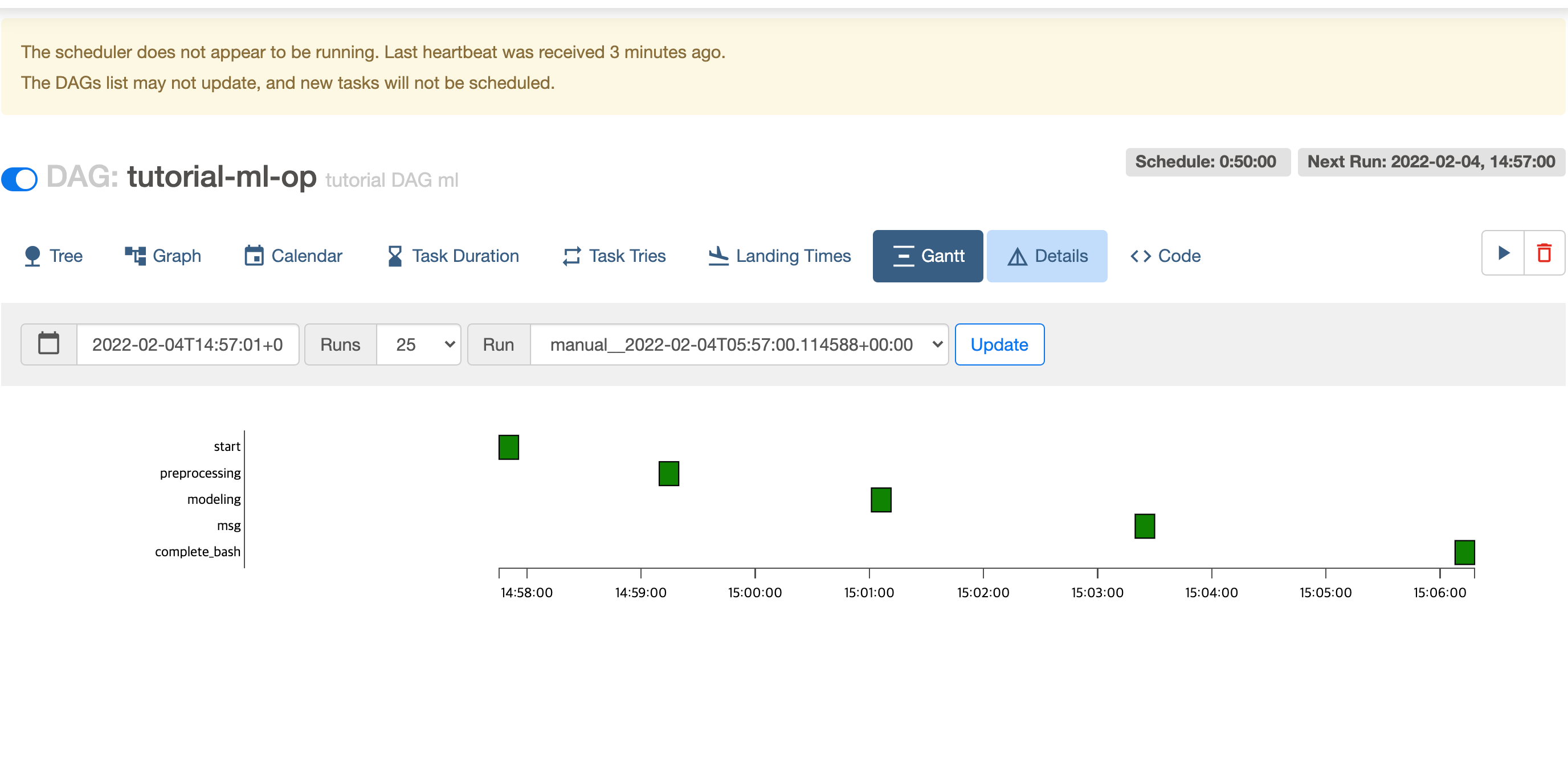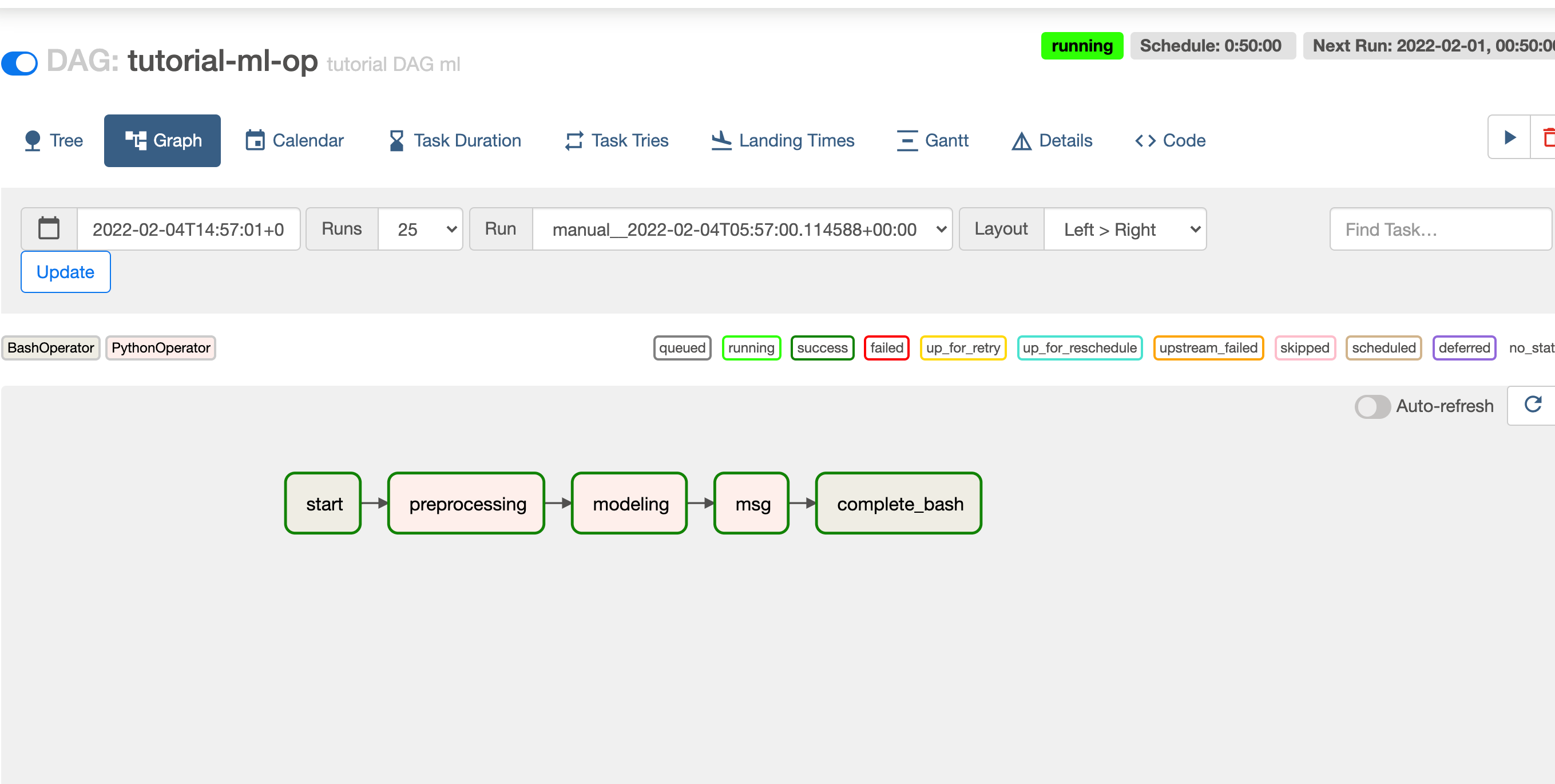 방금 등록힌 dag인 tutorial-ml-op라는 dag가 등록된 것을 확인할 수 있습니다.
