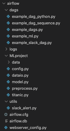 titanic.py 코드에는 titanic 데이터를 가져오고 전처리를 수행하고 머신러닝 모델 훈련을 수행하는 모든 일련의 작업이 담겨 있습니다. 총 2개의 함수로 구성되어 있으며 각 함수는 Airflow DAG 파일 안에서 task로 구성됩니다.