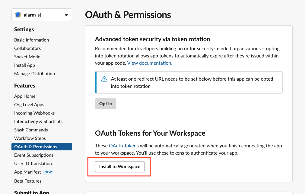 위의 OAuth가 추가 되었으면 다시 해당 메뉴의 최상단 위로 올라가서 install to workspace 버튼을 클릭해줍니다!
