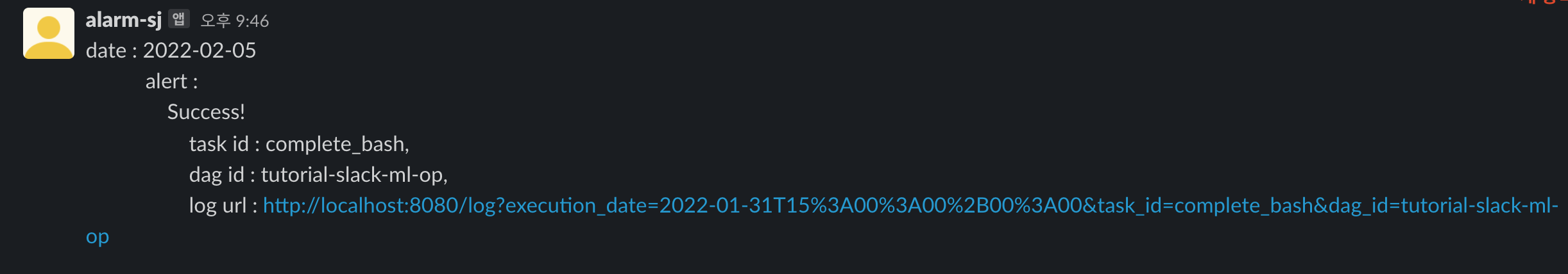 위 알람을 보시면 alert : Success! 까지 나오는데 뒤에 {msg} 부분이 알아보기 힘들게 나온 것을 확인할 수 있습니다. 사실 이 msg 자리에는 airflow의 context 값들이 넘어가게 됩니다. 그렇기 때문에 context에 있는 각종 값들이 위와 같이 다 나온 것을 확인할 수 있습니다.
