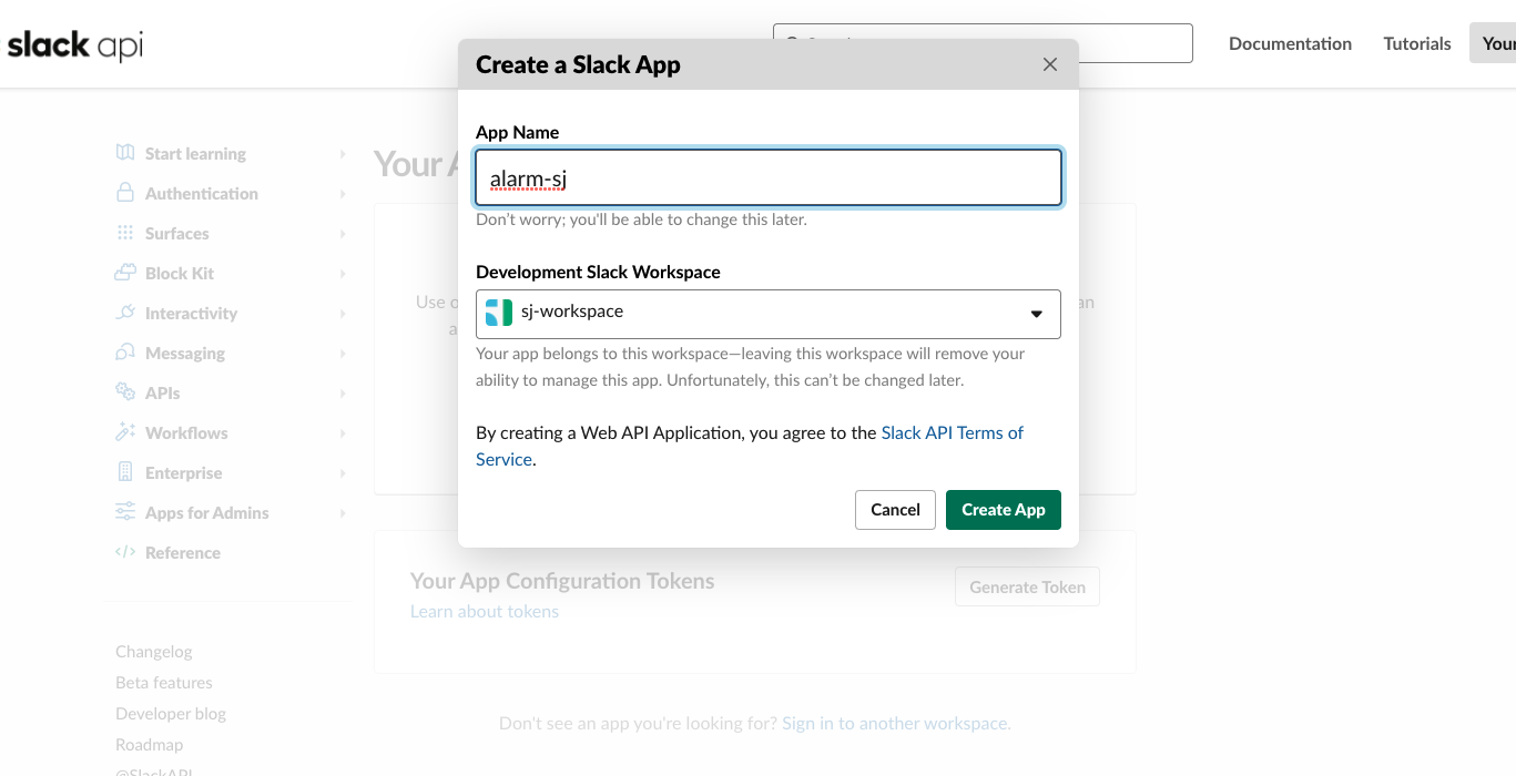 해당 사이트로 workspace를 달고 들어가면 create a slack app이라는 알람이 나옵니다. 여기서 app name을 지정해주고 workspace를 정한 뒤 app을 생성해줍니다.