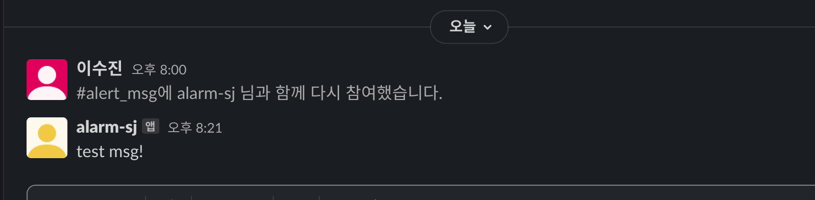 이렇게 제가 원하는 채널 ( 저는 alert_msg 채널명입니다. )에 bot을 추가 해준 뒤 다시 한 번 파이썬 환경에서 slack api로 메세지를 전달해보겠습니다.