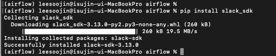 가장먼저 slack sdk 라이브러리를 설치해줘야 합니다. 아래와 같은 명령어로 사용하시는 파이썬 환경에 라이브러리를 설치해줍니다.