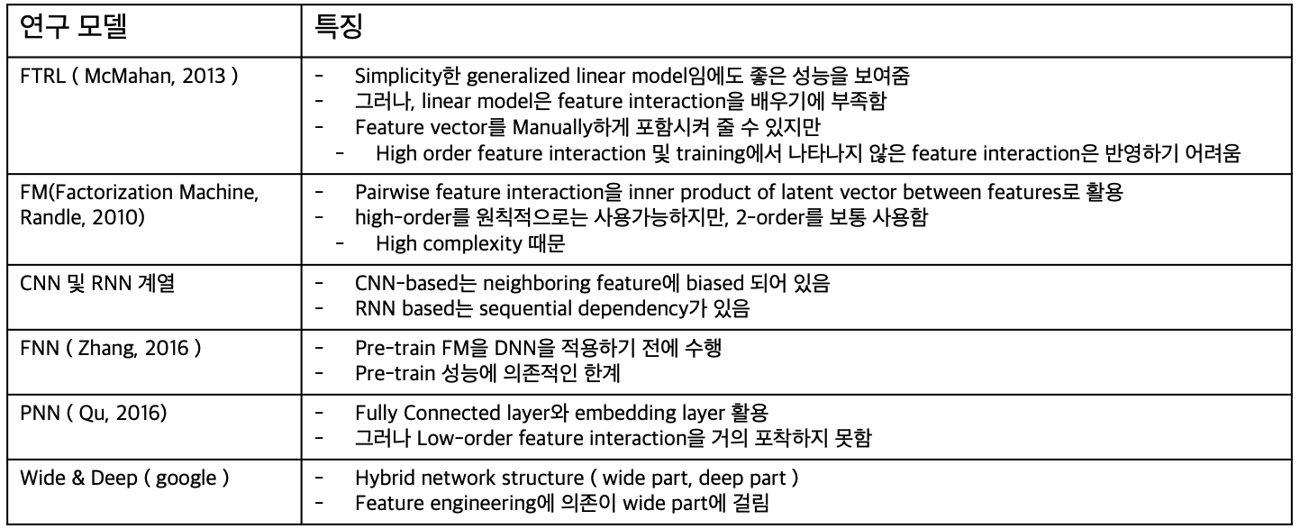 • Feature interaction을 학습하는 것은 CTR prediction model의 향상을 이끌어 냄
