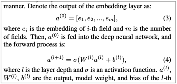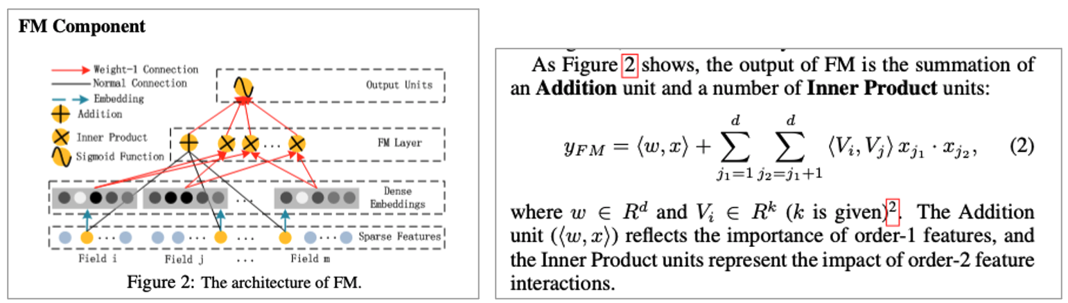 • V_i는 FM에 들어가서 2차원 interaction을 모델링, deep component에서는 고차원 interaction 모델링