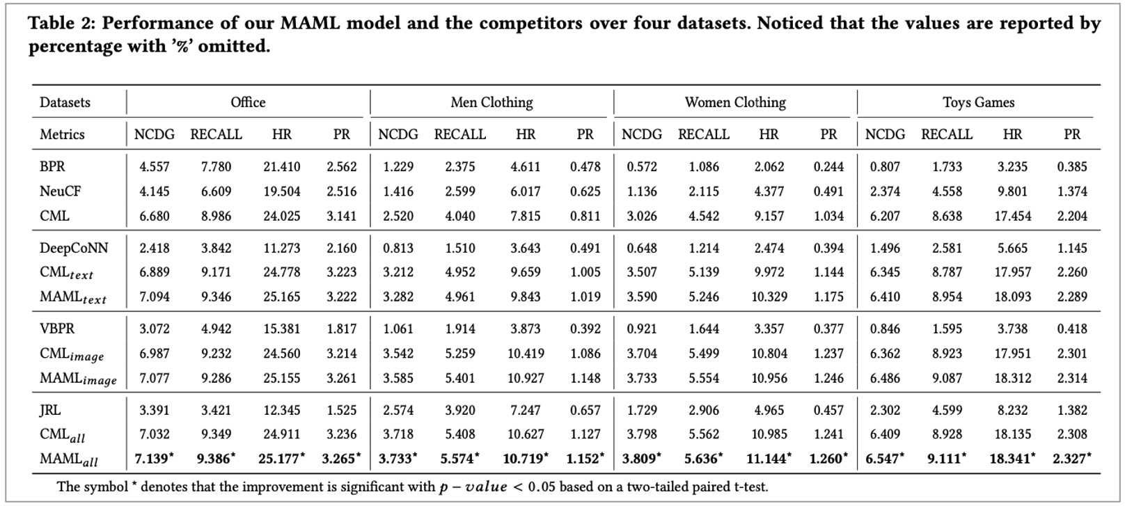 본 추천 시스템 논문은 MAML 모델을 소개합니다. 이는 Top-n recommendation 모델이며 Metric learning base모델입니다. metric learning을 활용해 Avoids limitation of matrix factorization based method하였으며 Can capture fine-grained user preference하였습니다.