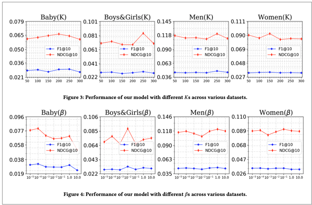 본 논문에서 진행한 두 번째 실험 파라미터에 따른 성능 평가입니다. K가 크면 overfitting 경향을 보였으며 β 는 trade off한 모습을 보였다고 합니다. implicit feedback과 user review information에서 β는 dataset마다 다르게 나타났으며 이는 도메인 의존성의 모습을 보여줬다고 하네요. 그리고 큰 β 는 too much on review information하였으며 큰 β 는 성능이 좋지 않은 모습을 보여줬다고 합니다.