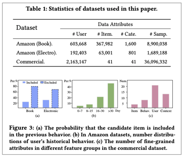 본 논문에서 사용한 데이터는 Amazon Dataset과 Commercial Dataset입니다. 그 중 Commercial Dataset은 Alipay recommendation system에서 나온 30일치 click log 데이터를 활용했다고 하며 candidate item, user specific, context, historical behavior 등이 포함되어 있다고 합니다. 이 commercial dataset의 특징은 다음과 같은 것들이 있습니다.