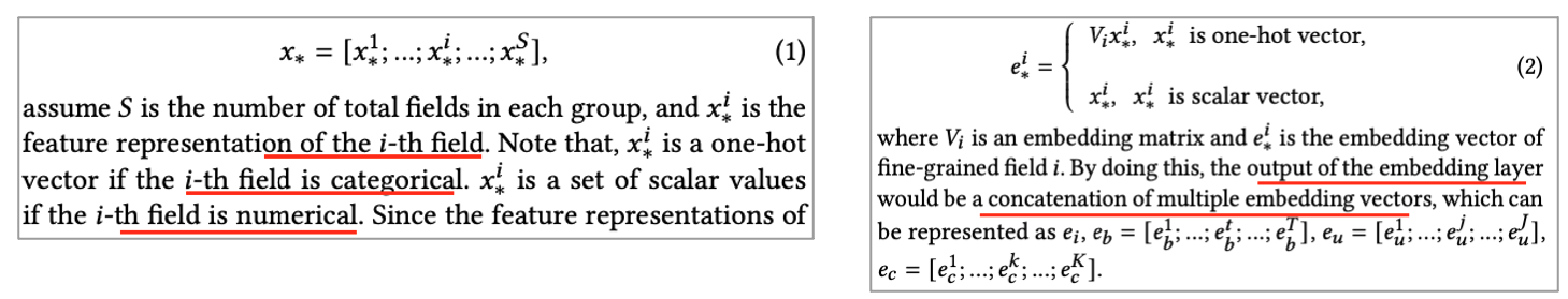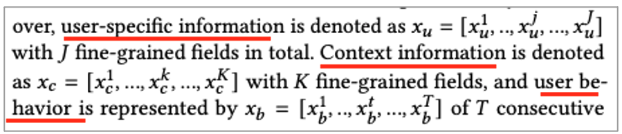 더불어서 본 논문에서는 Attention mechanism을 활용해 fine grained feature와 candidate item을 모델링한다고 합니다. 위에서 설명드린 각 표기법은 다음과 같습니다.