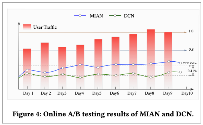 본 논문에서는 offline test외에도 online test도 진행했습니다. 이를 위해 A/B test를 진행하였으며 Alipay에서 10일동안 A/B testing을 진행하여 MIAN의 effectiveness를 설명합니다. 이때 A/B test 목표는 현재 best 모델인 DCN과 비교하여 CTR을 늘리는 것을 목표로 정하였습니다.