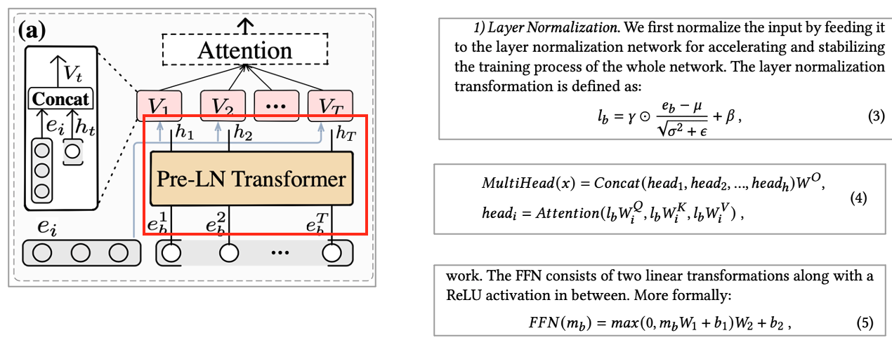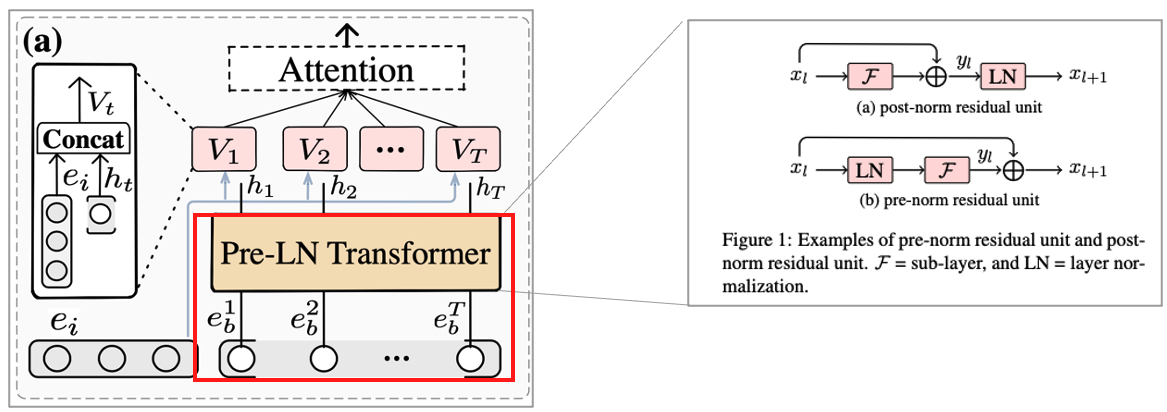 • Different subspace에서 sequential 동작의 사용자 선호도를 Adaptively explore 하기 위해 Pre-LN Transformer를 사용