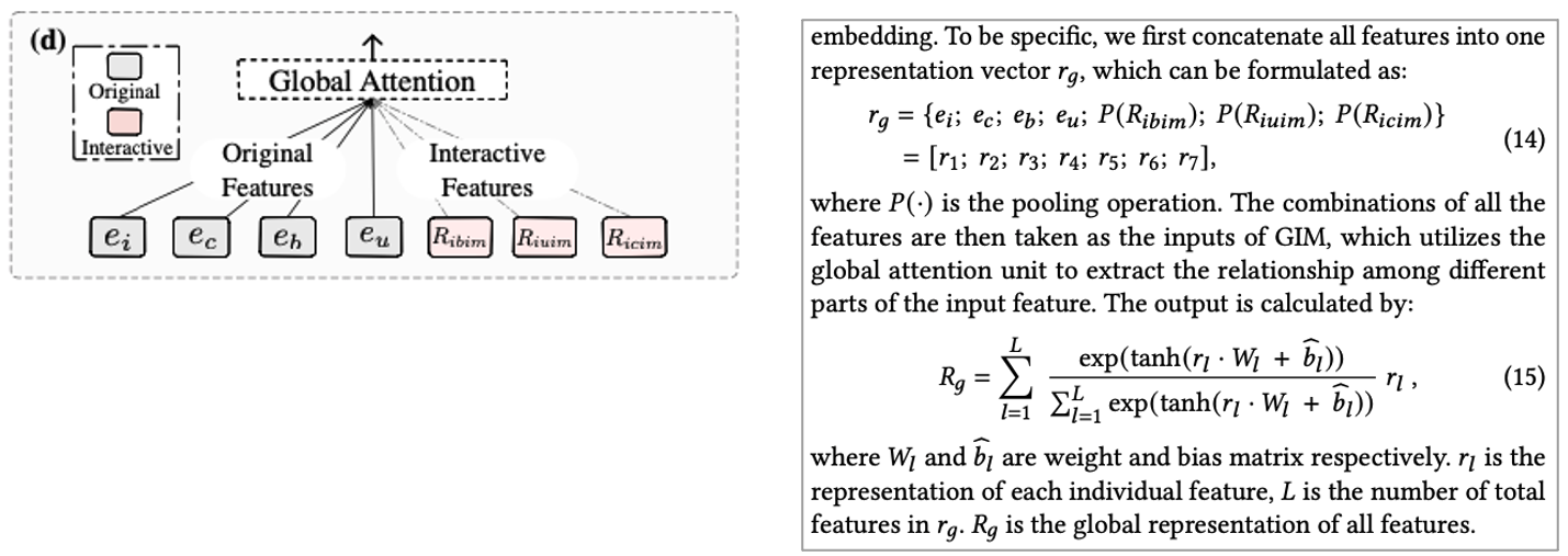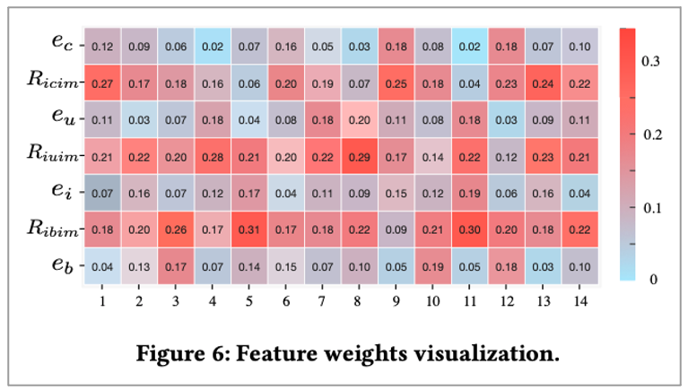 Ibim, uiim, icim은 original feature representation(e_c, e_u, e_i, e_b)에 비해 score가 더 크게 나오는 것을 확인할 수 있었으며 이는 High order feature interaction의 가능성을 시사한다고 합니다.