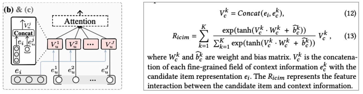 Fine-grained context information과 candidate 사이의 interaction은 중요한 요소이므로 Multi Interactive Layer의 Item Context Interaction Module(ICIM)에서는 이 부분에 집중합니다. 이전 연구들에서는 해당 정보에 크게 집중하지 않았다고 논문에서 이야기 하며 시즌, 날씨 등의 정보 등이 여기에 해당 된다고 합니다. ICIM은 IUIM과 비슷한 형태로 scaled attention representation 부여합니다.