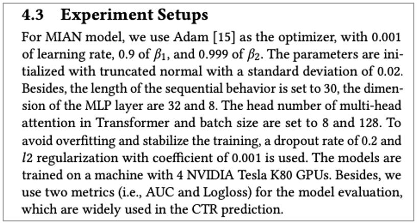 MIAN 추천 시스템 논문에서 사용한 baseline 방법들은 기존에 wide하게 사용되는 sota 모델들을 활용합니다. 사용한 모델들은 다음과 같고 DeepCTR pytorch를 활용했다고 합니다.