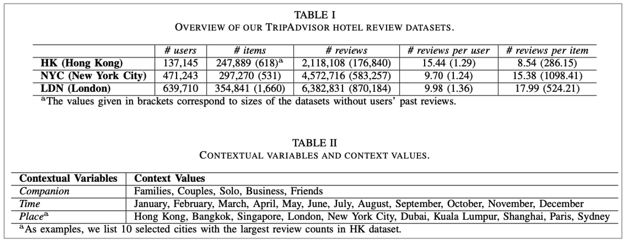 특징들을 정리하자면 Each review에는 userID, itemID, rating(1~5), textual review, context가 포함되어 있으며 Context에는 companion, time, place가 구성되어 있습니다. 그 외 자세한 것은 아래 표를 참고하시면 되겠습니다.