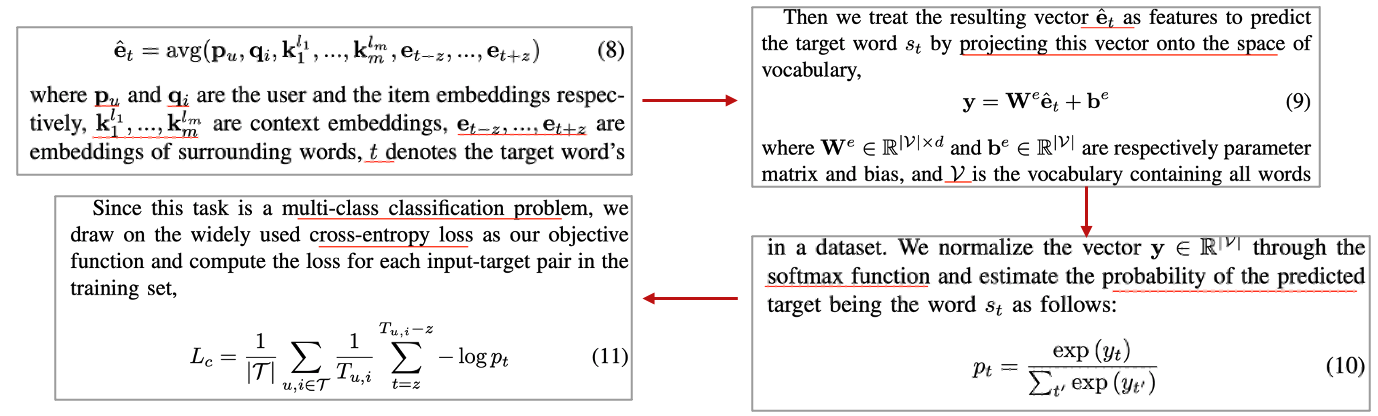 본 논문에서 사용자가 j번째 context를 선호한다는 선호도 반영을 위해서 [사용자 embedding, j번째 context]를 concat하여 Multi layer perceptron(MLP)에 태워줬습니다. 그 수식은 다음과 같습니다.