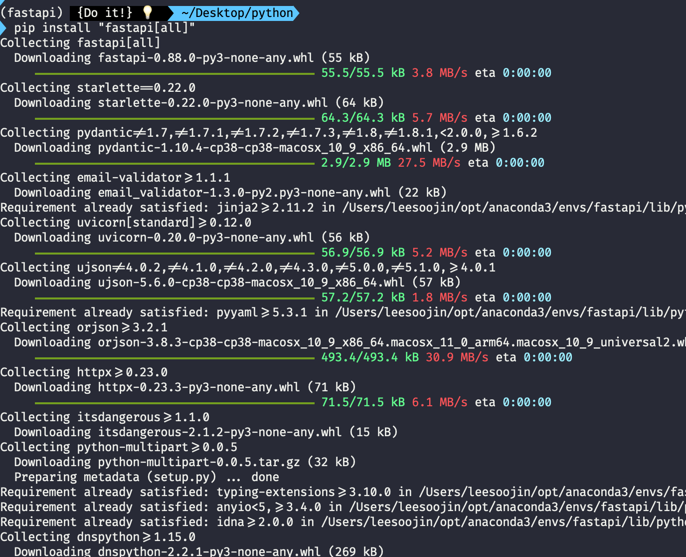 위 명령어를 사용하면 fastapi 설치에 필요한 모든 라이브러리까지 함께 설치됩니다. 만약, pip install fastapi와 같이 설치하게 된다면 uvicorn과 같은 의존성 걸리는 라이브러리를 따로 설치해주어야 합니다.