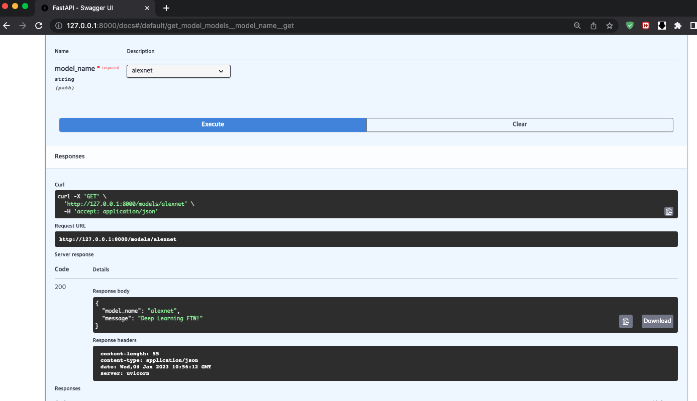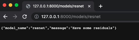 즉, 만약 model_name이 alexnet이라면 Deep Learning FTW 라는 메세지가 리턴되고 lenet이라면 LeCNN all the images라는 메세지가 리턴이 됩니다. alexnet, lenet도 아니라면 Have some residuals라는 메세지가 return 됩니다.