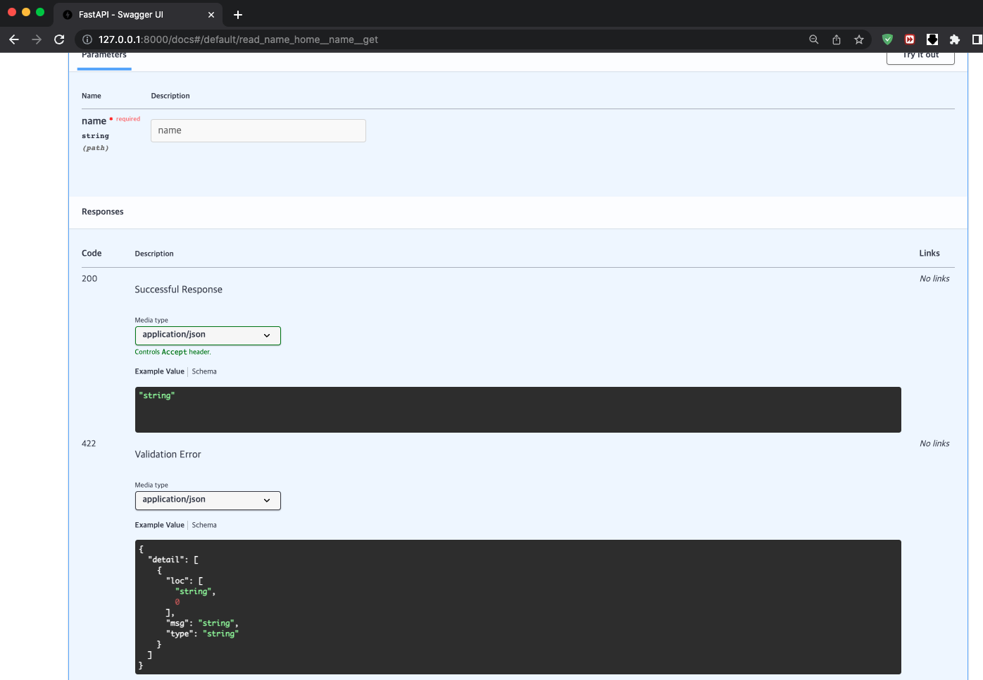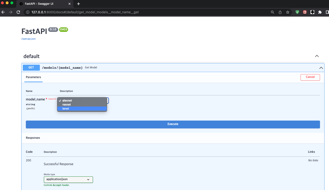 또한, FastAPI docs에서도 확인할 수 있는데요. 흥미로운 것은 저렇게 input 형태를 지정해주면 Swagger UI에서 값을 선택해 테스트를 해볼 수 있다는 점입니다.