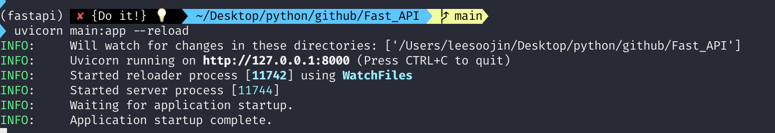 제 파이썬 파일 이름이 main이므로 main:app을 uvicorn으로 실행하겠다는 의미를 가집니다. reload는 업데이트 등이 일어났을 때 reload하겠다는 의미입니다.