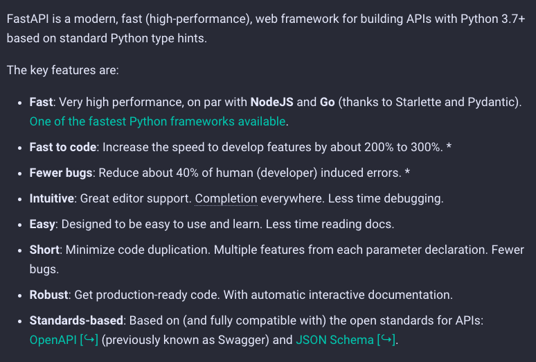 즉, FastAPI라는 것은 Python3.6+ 환경에서 API를 빌드하기 위한 web framework라는 것이고 빠르다는 것이 주된 특징입니다.
