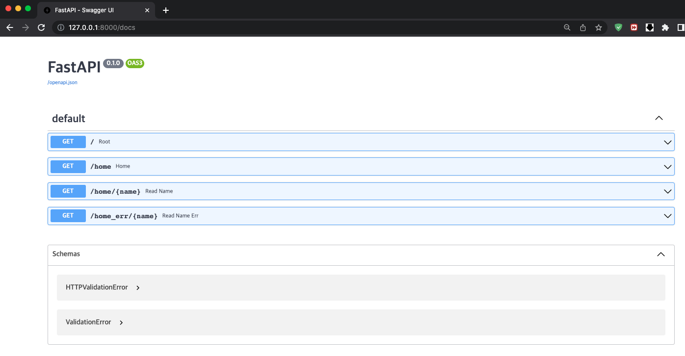 FastAPI의 주요 특징중 하나는 Swagger UI를 지원해주는 것입니다. 표준 API를 지원해주기에 가능한 것이겠죠? Swagger UI를 통해 API가 구성된 것을 한 눈에 확인할 수 있습니다.
