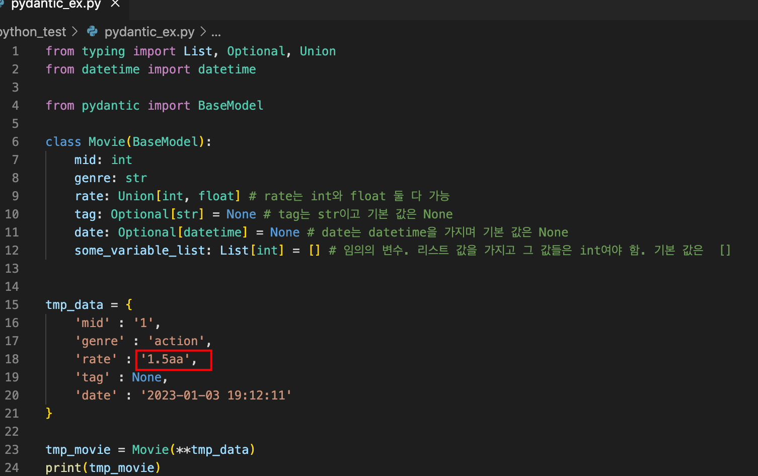 먼저, 위와 같은 코드를 작성해보겠습니다. 위 코드는 Movie라는 class를 정의했고 해당 class는 pydantic의 BaseModel을 상속해서 활용합니다. BaseModel은 객체를 정의하는 방법을 제공해줍니다.