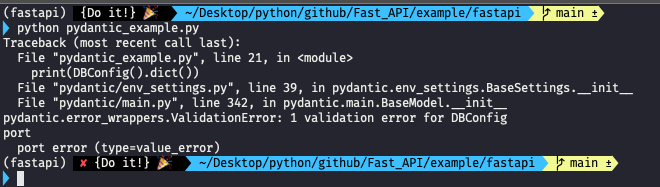 위 코드에서는 @validator("port")라고 설정해서 port 변수에 대한 valid를 체크합니다. 만약, port가 3306이나 8080이 아니라면 port error라는 Value Error가 나오도록 하는 것이죠. 이 상태에서 같은 .env를 실행시키면 어떻게 될까요? 확인해보겠습니다.