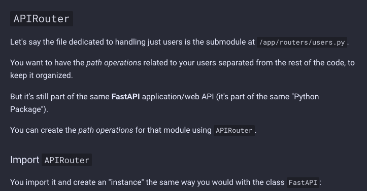 FastAPI에서 라우터(router)라는 것은 일종의 sub fastapi application과 같은 느낌입니다. 하나의 파일을 통해 모든 것을 구성하는 것이 아니라, 각 특성에 맞는 코드와 파일을 분리하고 이를 조합해 더 큰 application을 만들게 도와주는 구조입니다.
