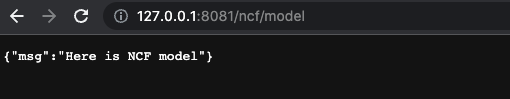 또한, 각각의 http://127.0.0.1:8081/ncf http://127.0.0.1:8081/ncf/model 등의 path로 이동하면 지정한 결과가 나오는 것을 확인할 수 있습니다.