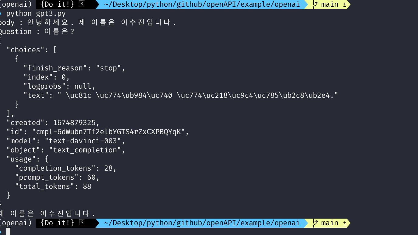 제가 위 파이썬 파일을 실행하면서 gpt3에게 바라는 답은 '이름'을 답해주길 기대했습니다. 실제로 gpt 모델의 결과를 보면 제 이름을 답해주면서 그 기대값에 응하는 답을 준 것을 확인할 수 있습니다.