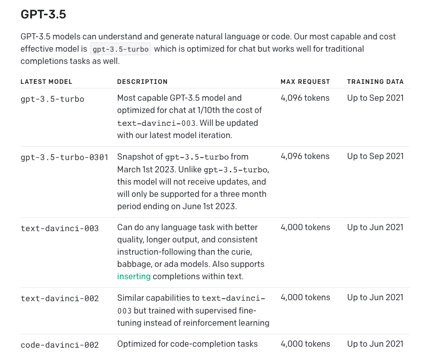 즉, GPT3.5는 ChatGPT의 일종의 전신(?)이라고 표현할 수 있겠습니다. 따라서, ChatGPT와 유사한 성능의 모델을 사용하려면 GPT3.5 기준의 모델을 사용해야 한다는 것을 유추할 수 있습니다. 그럼 OpenAI에서는 GPT3.5를 지원해줄까요? openai의 공식 자료를 보면 아래 사진과 같은 내용이 담겨져 있습니다.