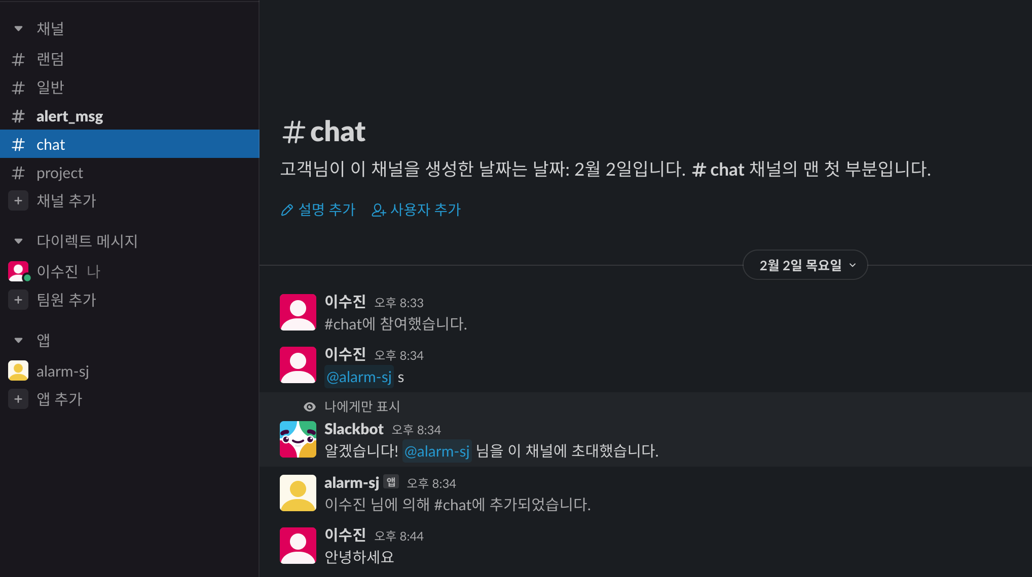 저는 chat이라는 slack 채널에서 안녕하세요 라고 메세지를 남겼습니다. 이제 위 Python 코드에서는 chat이라는 slack channel에서 '안녕하세요' 라는 데이터를 받아 openai gpt에 값을 넣어줍니다. gpt 모델은 텍스트 입력 값을 받아 응답 메세지를 생성해 보내주고 코드에서는 이 응답 값을 alert_msg 채널에 보내주도록 만든 것입니다. 그리고 위 사진은 그 결과를 보여줍니다.