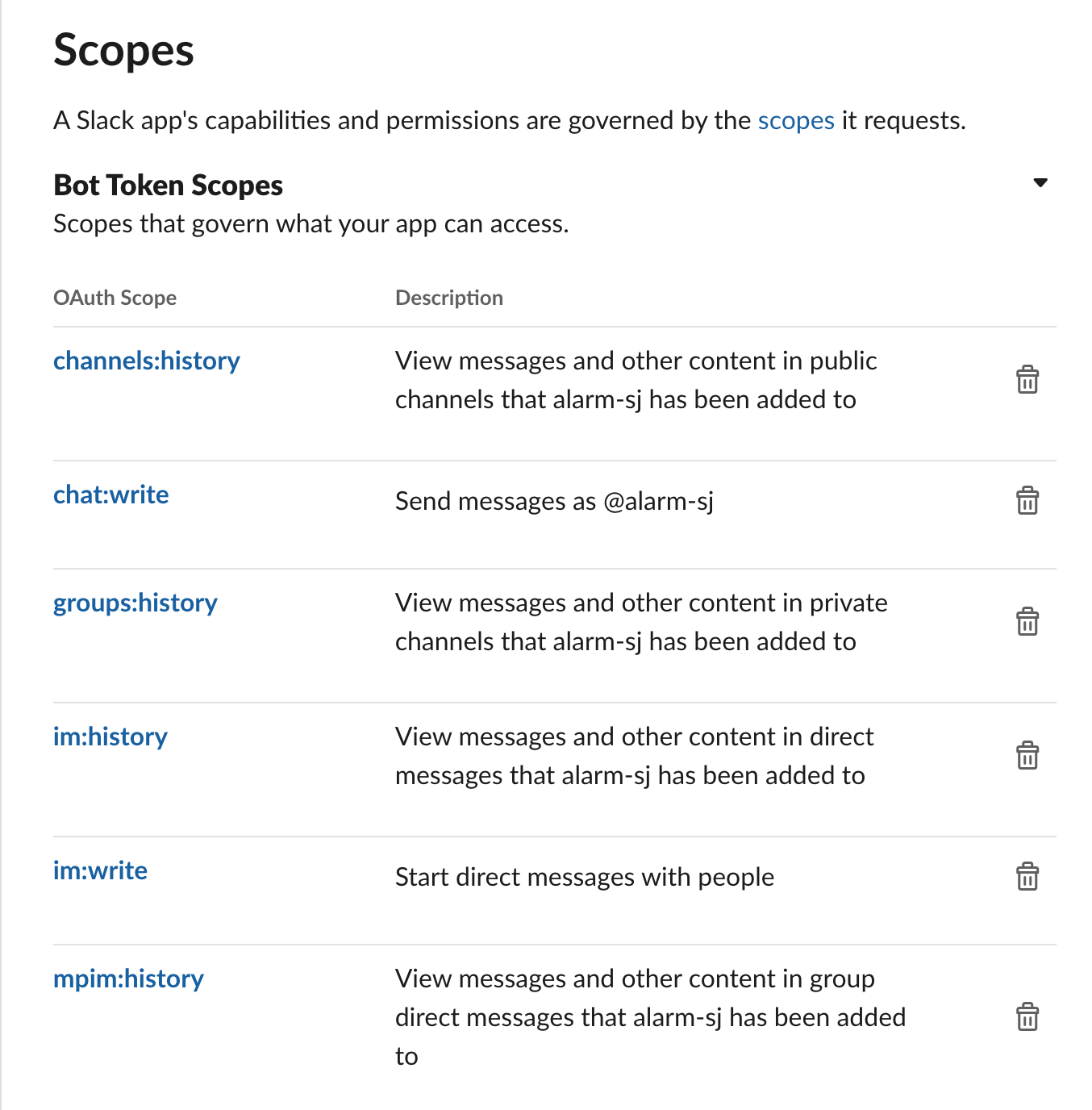 위 메세지에서 나오는 channels:history, groups:history 등을 셋팅해줘야 slack의 내용을 읽고 통신할 수 있습니다. 해당 권한은 api slack의 OAuth & Permissions에서 설정할 수 있습니다.